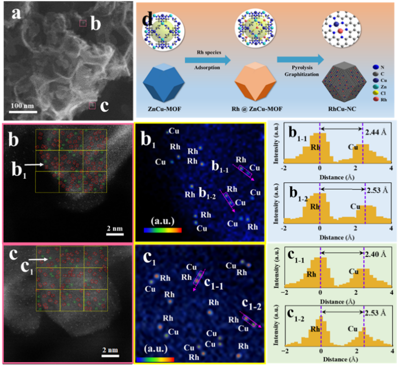 研究人员创新地发展了封装热解策略,在氮掺杂石墨碳载体上成功构筑了结构稳定、空间邻近的Rh-Cu异核双原子催化位点,如下图所示。该催化剂形成了明确的Rh-Cu-N6配位结构,其中Rh-Cu原子间距约为2.42 Å。研究发现,这种双原子位点能够通过电子耦合与电荷极化效应实现功能分工:Rh位点主要负责甲烷C–H键活化,Cu位点则对氧物种形成“配位约束”,从而有效抑制过度氧化,促进甲醇生成。
